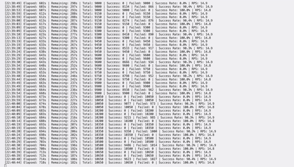 Ảnh chụp màn hình đầu ra nhật ký hệ thống từ một phiên kiểm tra tải hiển thị các chỉ số hiệu suất thời gian thực bao gồm thời gian đã trôi qua, tổng số yêu cầu, số lượng thành công và thất bại, tỷ lệ thành công phần trăm và số yêu cầu mỗi giây (RPS). Nhật ký trải dài từ 22:38:49 đến 22:40:41, hiển thị RPS nhất quán khoảng 14,8–14,9 và các chu kỳ luân phiên tỷ lệ thành công 0%, ~90% và 100% trên khoảng 9.000 đến 10.650 tổng số yêu cầu.