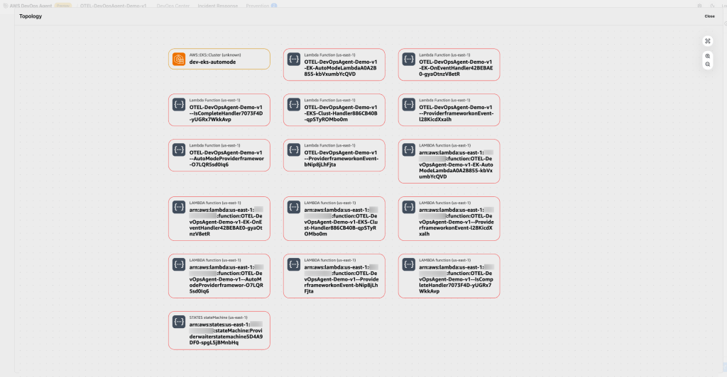 Hình 17: Ảnh chụp màn hình cấu trúc liên kết của cluster Amazon EKS được khám phá bởi AWS DevOps Agent