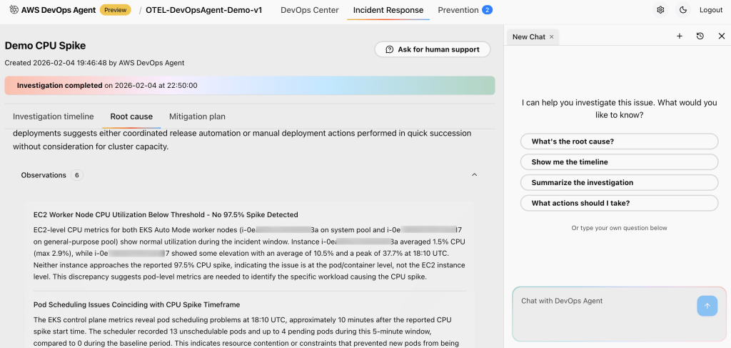 Phần này trình bày chi tiết cách sử dụng AWS DevOps Agent để điều tra và phân tích sự kiện.