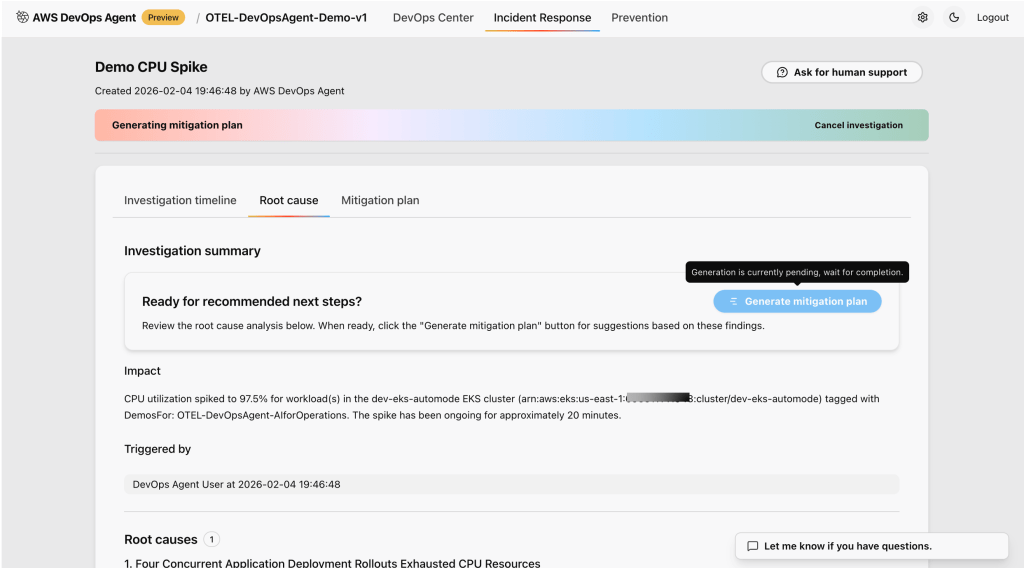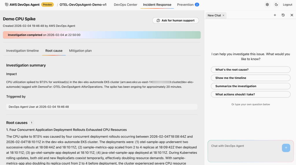 Những gì bạn nên quan sát: Khi bài kiểm thử bắt đầu, AWS DevOps Agent phát hiện sự sai lệch so với đường cơ sở đã thiết lập và bắt đầu một cuộc điều tra. Trong chế độ xem phản hồi sự cố của agent, bạn sẽ thấy các kết quả sau: