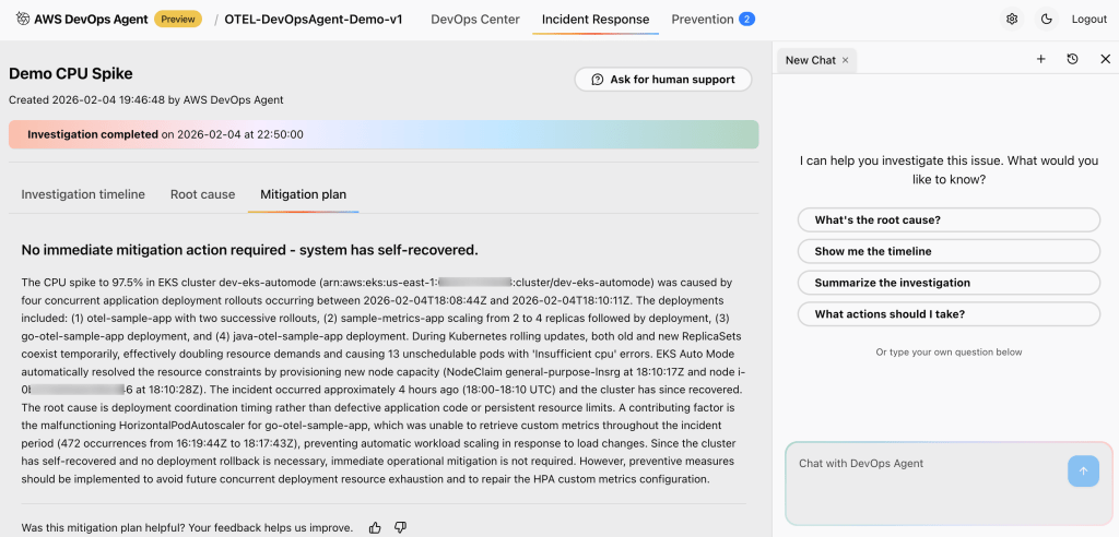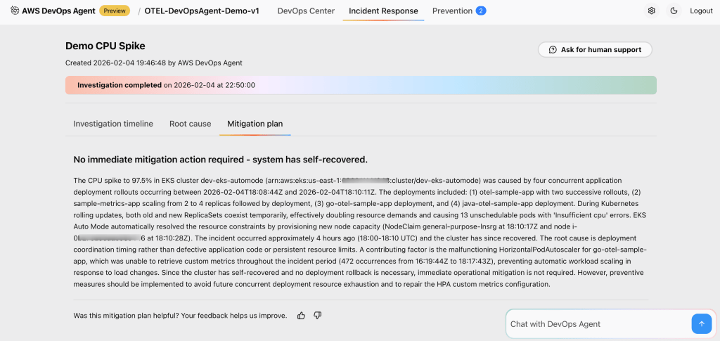 Hình 10: Ảnh chụp màn hình kế hoạch giảm thiểu được đề xuất bởi AWS DevOps Agent