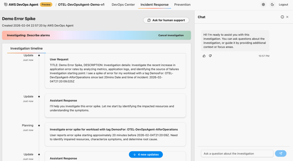 Truy cập giao diện web của AWS DevOps Agent và bắt đầu một cuộc điều tra mới: