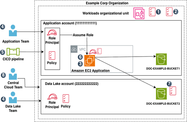Có ba nhóm tham gia vào ví dụ này: Nhóm Cloud Trung tâm (Central Cloud Team), Nhóm Ứng dụng (Application Team) và Nhóm Data Lake (Data Lake Team). Nhóm Cloud Trung tâm chịu trách nhiệm về bảo mật và quản trị tổng thể của môi trường AWS trên tất cả các tài khoản AWS tại Example Corp. Nhóm Ứng dụng chịu trách nhiệm xây dựng, triển khai và chạy ứng dụng của họ trong tài khoản ứng dụng (111111111111) mà họ sở hữu và quản lý. Tương tự, Nhóm Data Lake sở hữu và quản lý tài khoản data lake (222222222222) lưu trữ một data lake tại Example Corp.