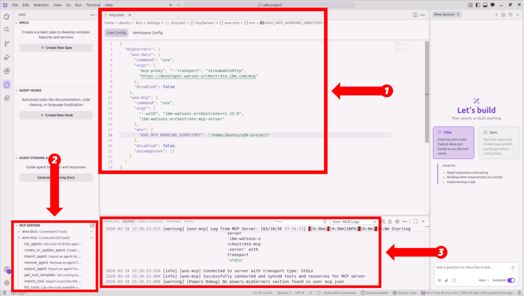 Phần này sẽ hướng dẫn bạn cách thiết lập watsonx Orchestrate MCP Servers và extension trong Kiro. Bạn cũng sẽ học cách tạo và kiểm tra tác nhân bằng cách sử dụng các mô hình nền tảng (FM) trên Amazon Bedrock.