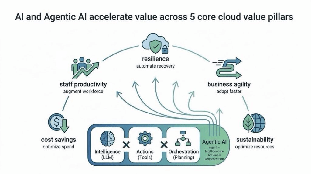 Hình 1: AI và Agentic AI tăng tốc giá trị đám mây trên năm trụ cột của Khung đánh giá giá trị đám mây
