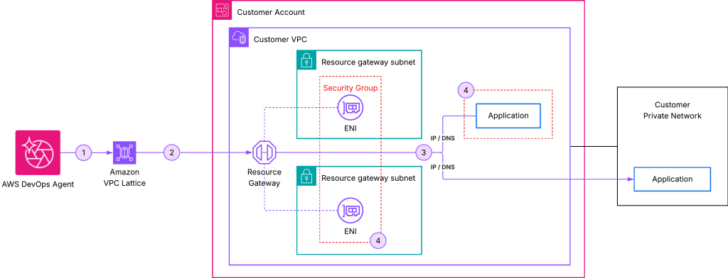 - AWS DevOps Agent tạo một resource gateway được quản lý bởi dịch vụ và cấp phát các elastic network interfaces (ENIs) của nó trong các subnet bạn đã chỉ định.