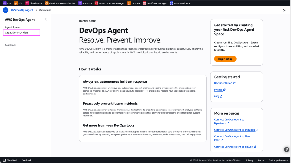 Bước 1: Mở AWS DevOps Agent console. Trong ngăn điều hướng, chọn Capability providers: