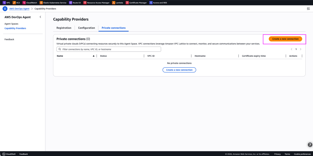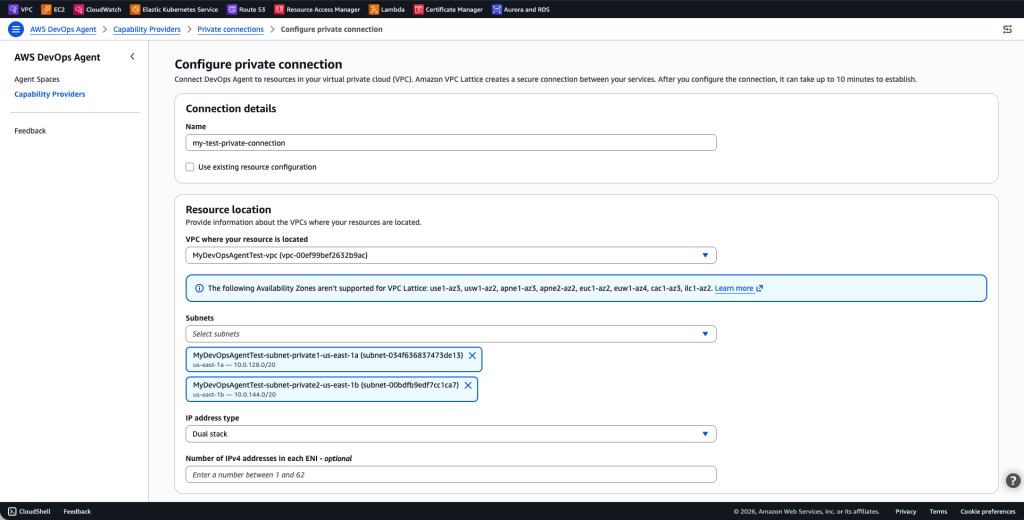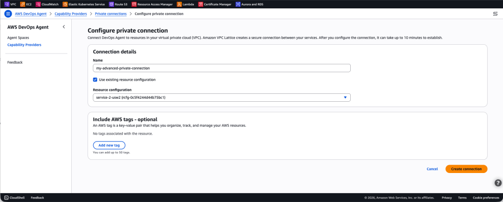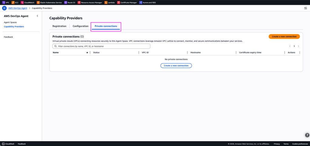 Để bắt đầu, hãy mở AWS DevOps Agent console và tạo kết nối riêng tư đầu tiên của bạn. Để biết thêm chi tiết, hãy xem Kết nối riêng tư trong Hướng dẫn sử dụng AWS DevOps Agent.