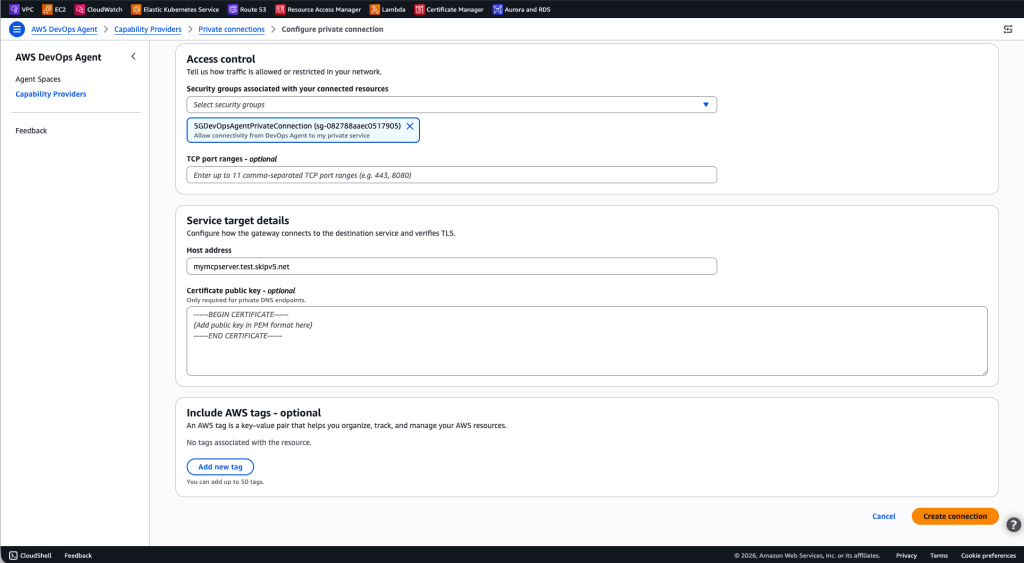 mymcpserver.test.skipv5.net. Các IP dịch vụ phải có thể truy cập được từ VPC đã chọn. Nếu bạn chọn một tên DNS, nó phải có thể phân giải công khai. - (Tùy chọn) Certificate public key: Khóa công khai chứng chỉ mà DevOps Agents sử dụng để kết nối an toàn với đích của bạn.