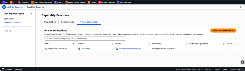 Sau khi kết nối riêng tư đạt trạng thái Completed, hãy xác minh rằng AWS DevOps Agent có thể truy cập dịch vụ đích của bạn: